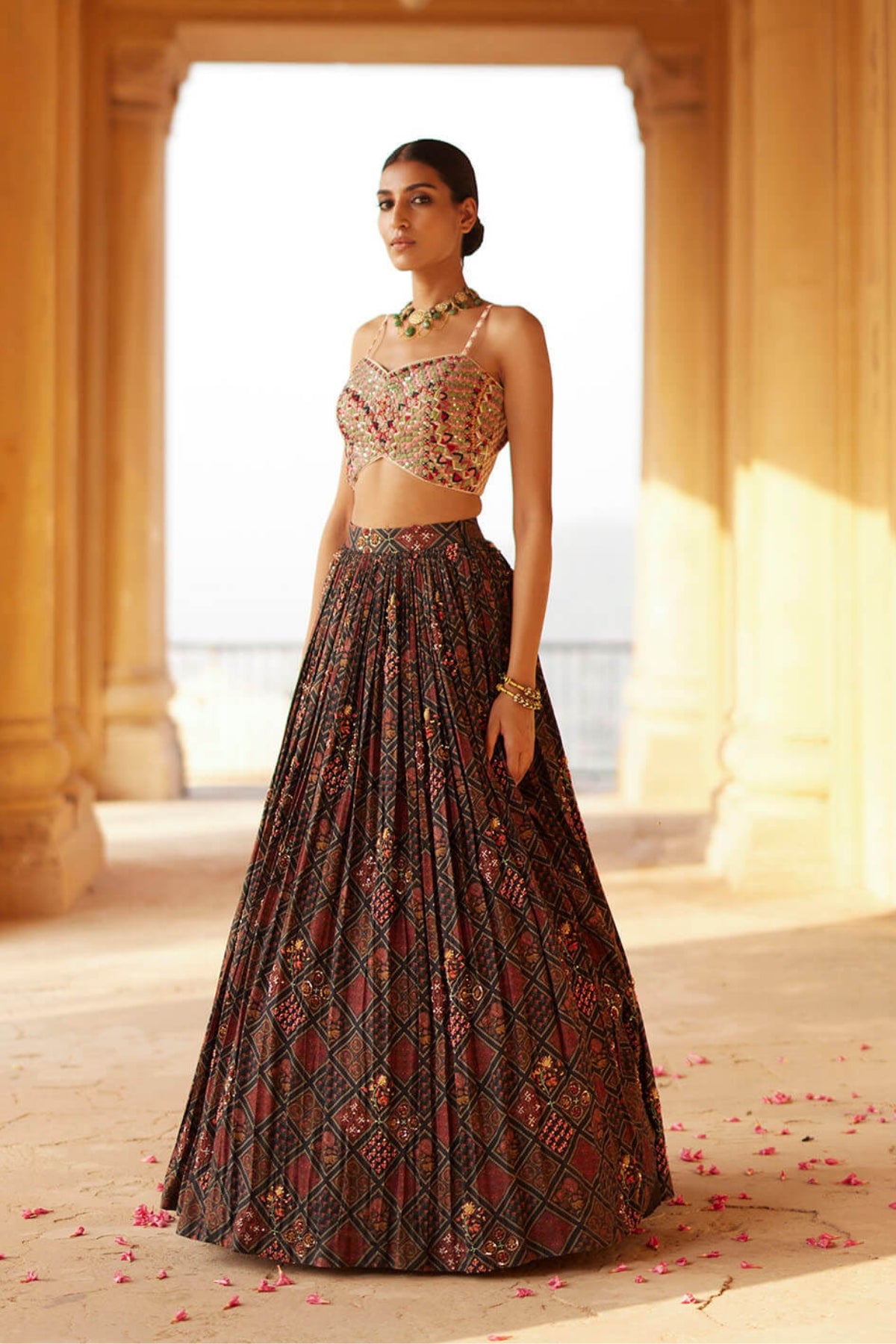 Silk printed lehenga highlighted with hand embroidery & a bustier embellished with threads & beads in multi colour