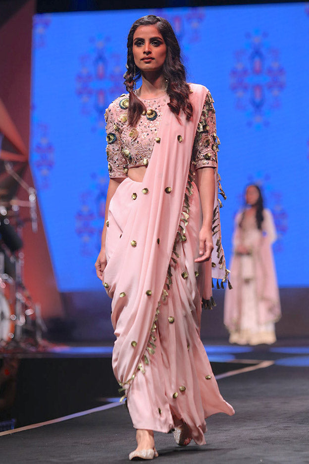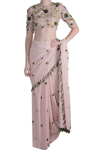 Designer Payal Singhal: Rose pink embroidered georgette chili & sari. Comes with petticoat