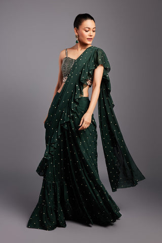 Georgette Predraped ruffle Saree Paired With zardozi and glass beads Embroidered Bralette