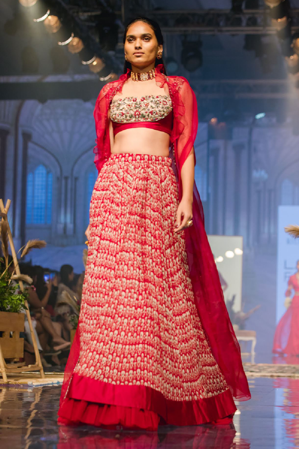 Blue or Red Print Option Lehenga with Embroidered Blouse and Organza Cape. If you want to opt for a dupatta in place of cape, please specify at checkout
