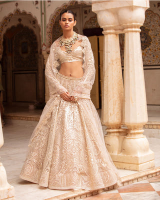 • POWDER PINK-BASED, LIGHT GOLD LEHENGA WITH ARCHITECTURAL MOTIFS IN PRINTED CHROME APPLIQUE AND IVORY THREADWORK DETAILS. THE LEHENGA SKIRT IS PAIRED WITH A FULL-SLEEVED, WIDE-NECK, CROPPED BLOUSE HAVING CRYSTALS AND SEQUINS; AND A TULLE DUPATTA WITH BORDER.