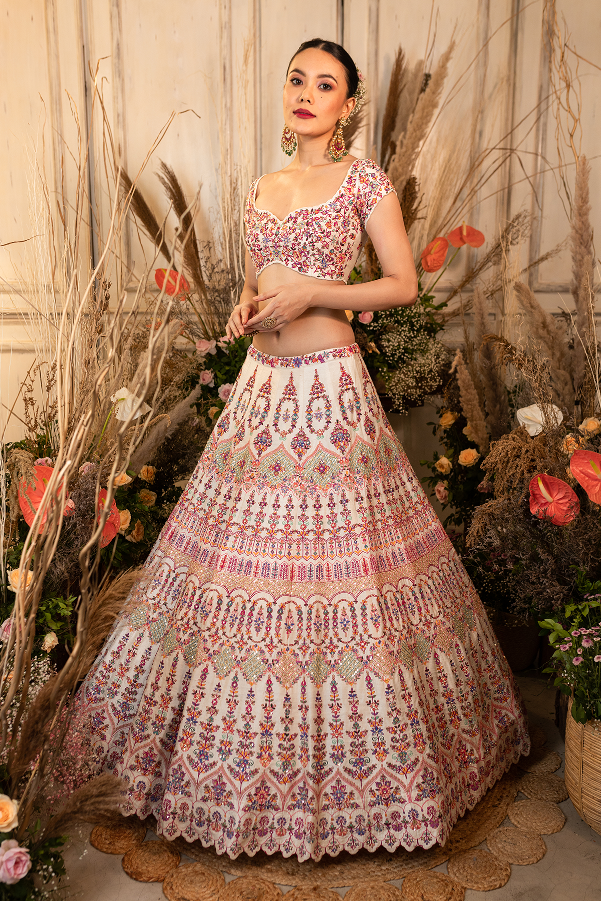 Ivory Silk lehenga with very fine multi hued resham embroiderey with the touch of sequins and glass beads paired with mauve pink organza dupatta broad embroidered.