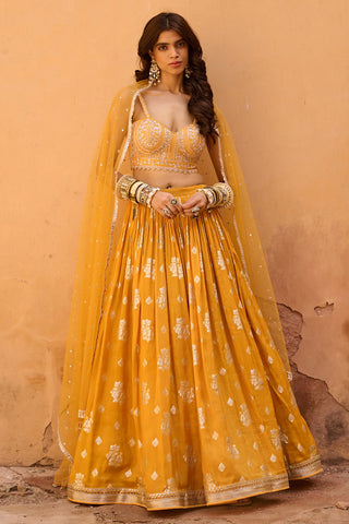 Jacquard Skirt With Zardozi,Glassbeads,Pearl Embroidered Blouse And Tulle Dupatta