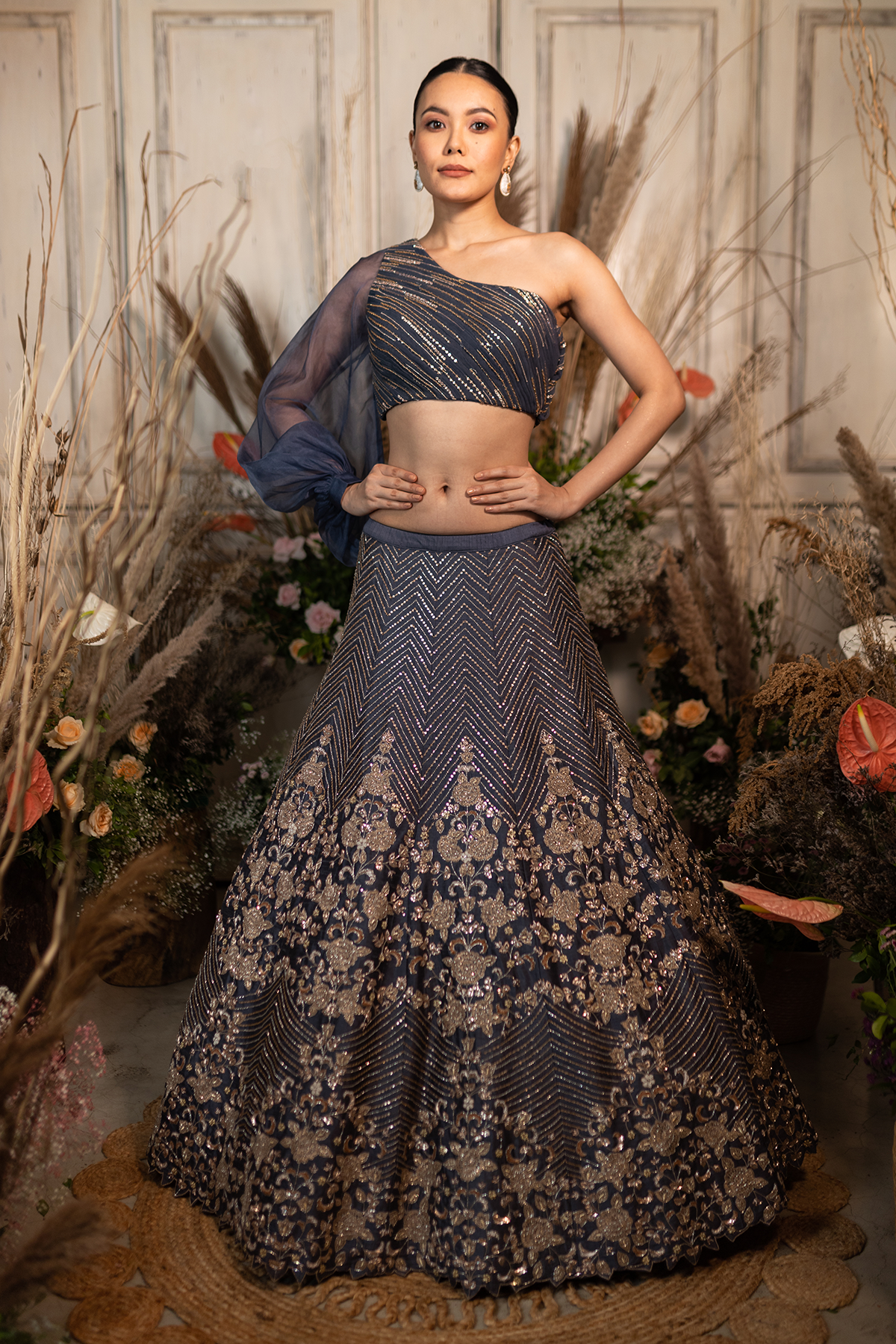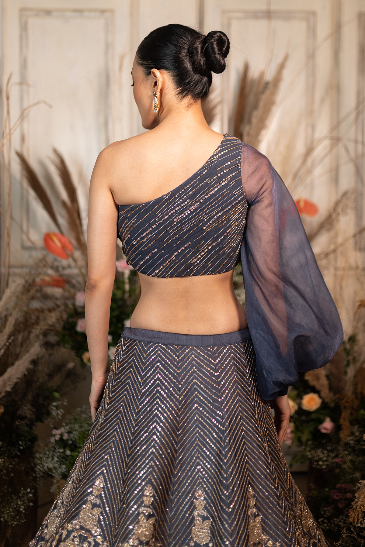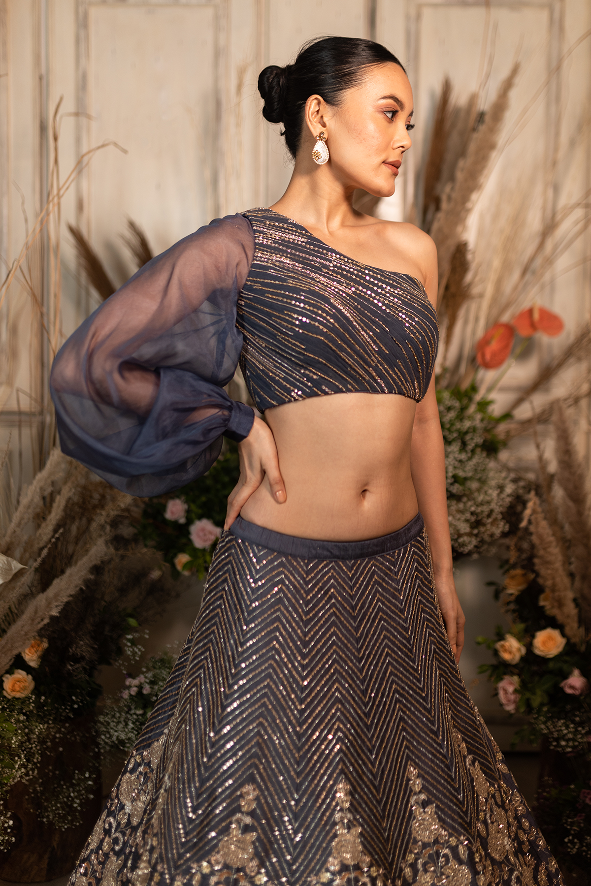 Somber slate grey silk lehenga with bold floral chevron embroidery and with well cutted one shoulder perfect puff sleeve blouse. simple dupatta