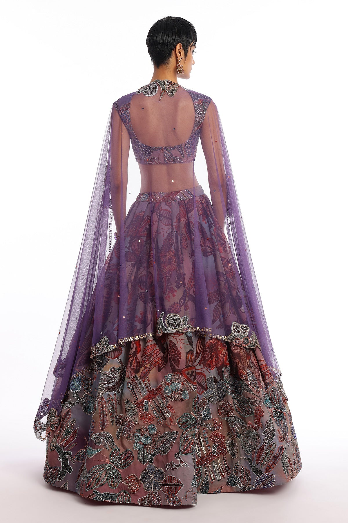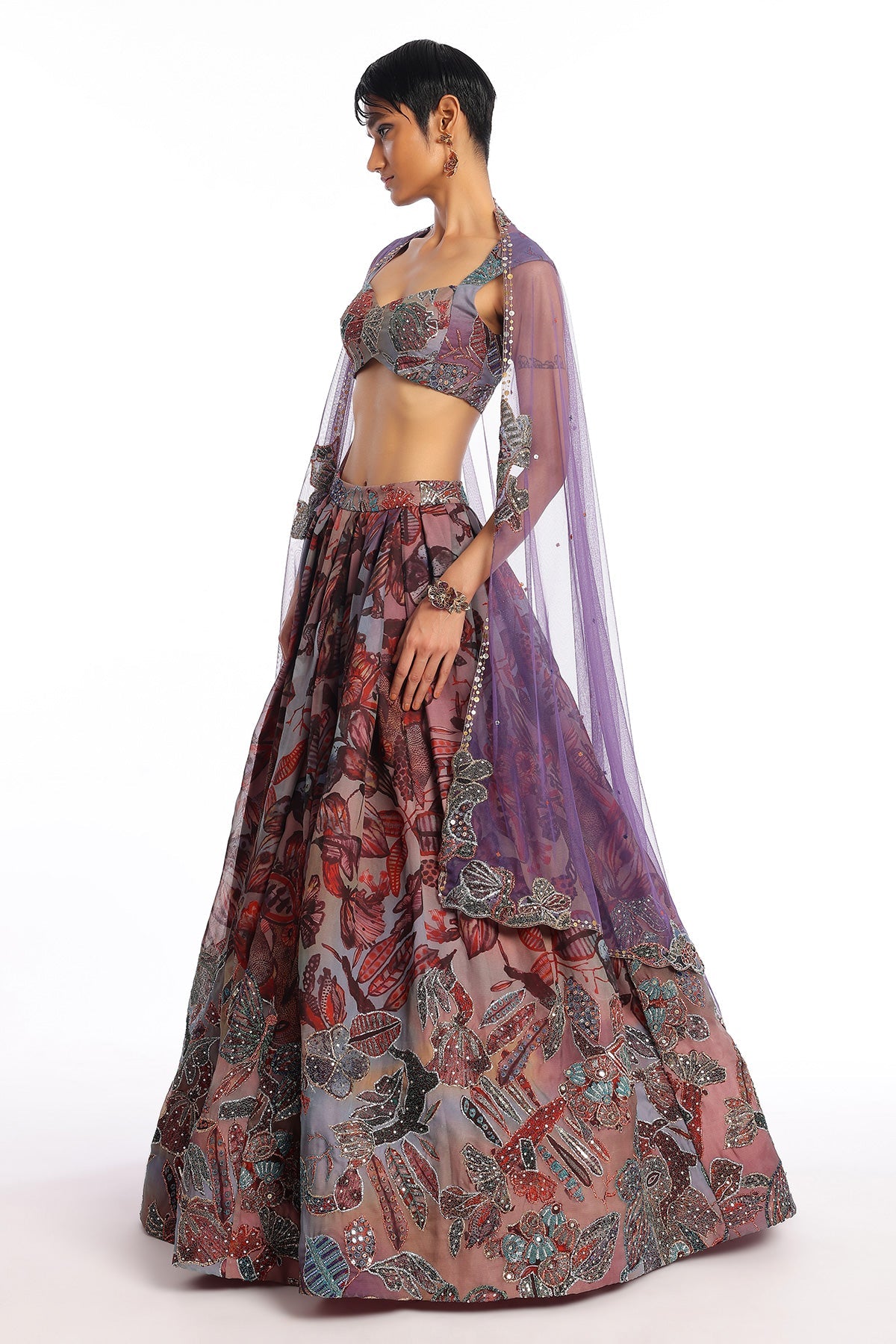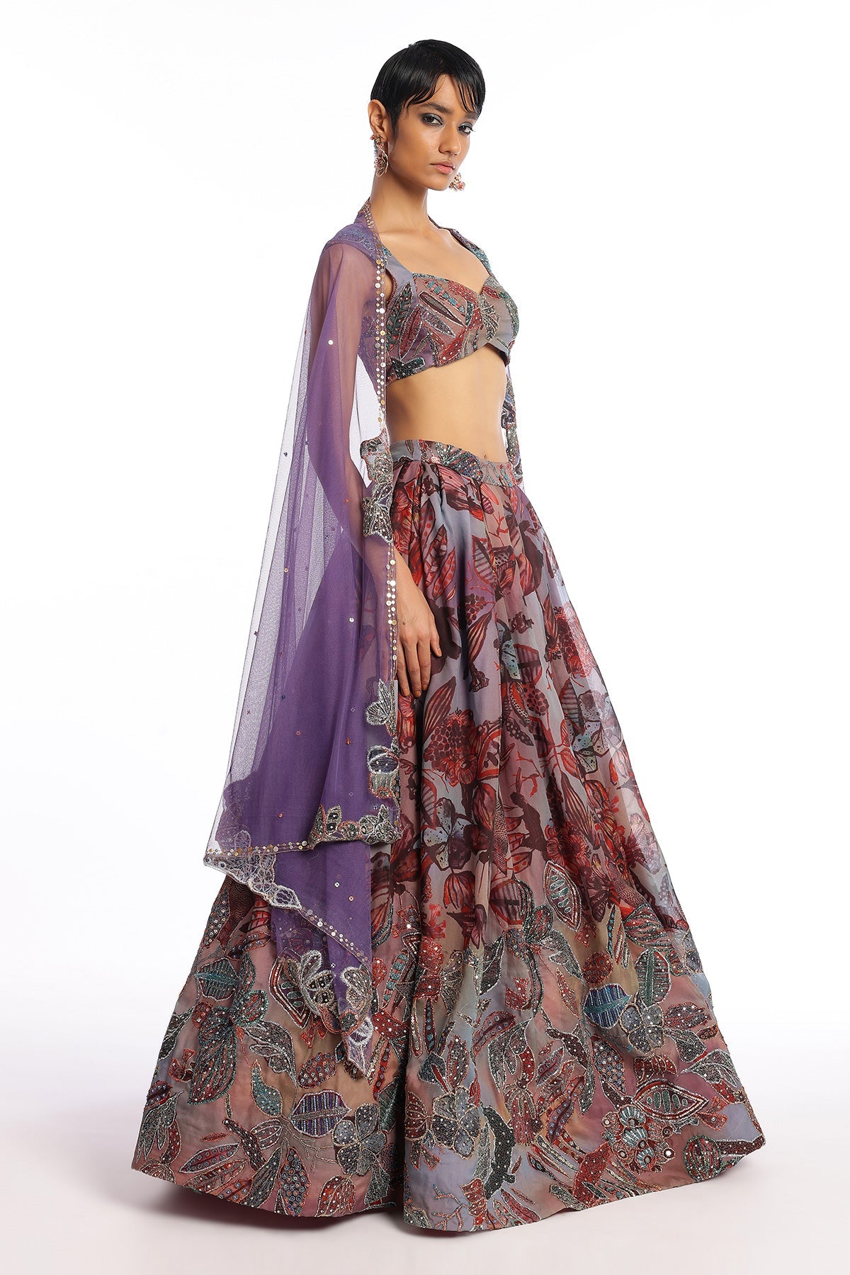 Kinfolk catawba printed applique embellished organza lehenga and blouse with tulle dupatta