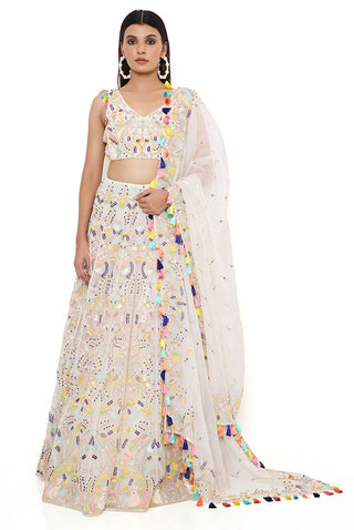 Off white organza embroidered choli and lehenga with mukaish organza dupatta.