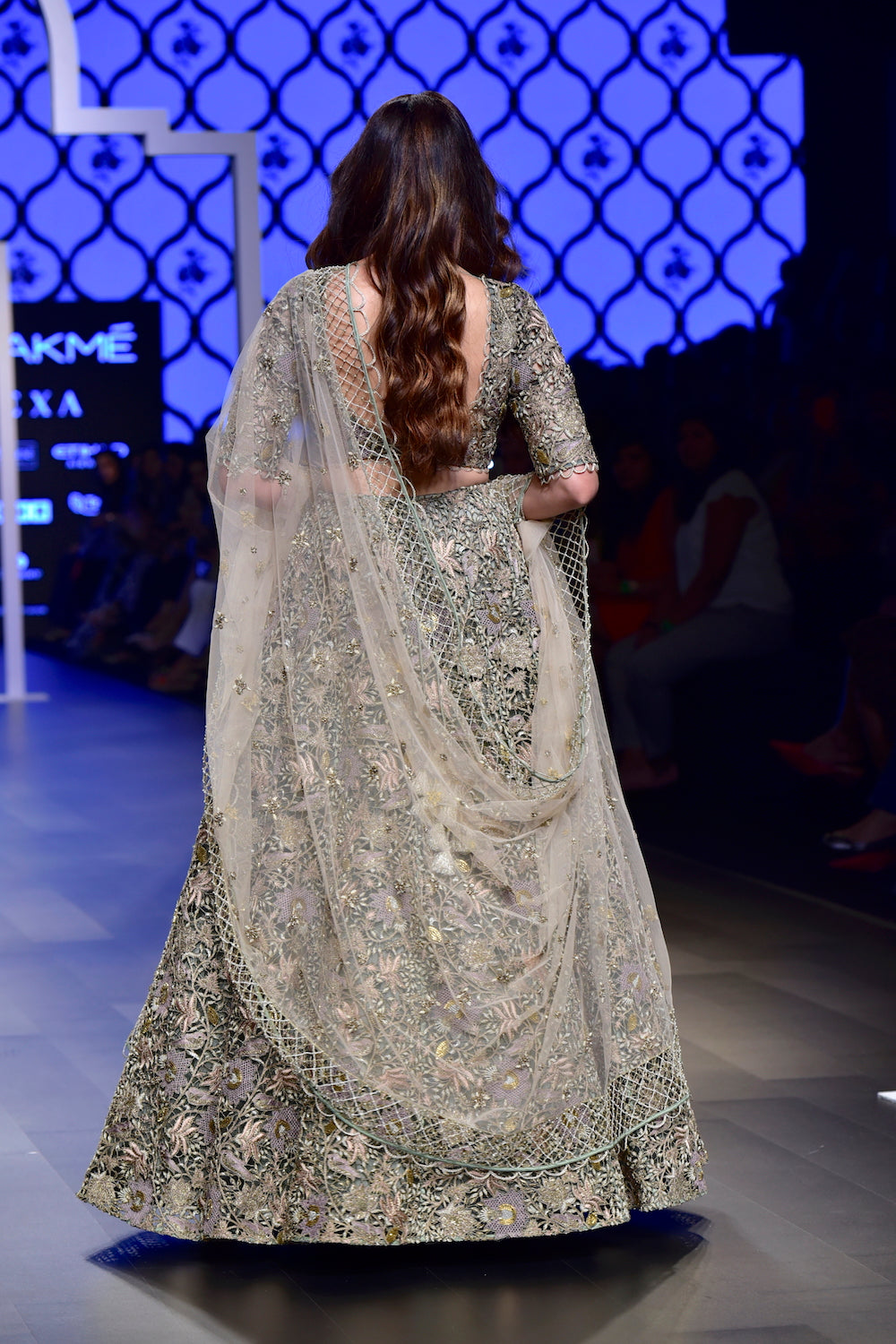 Designer Payal Singhal: Mint cutwork embroidered choli & lehenga with blush net embroidered dupatta & cutwork border.