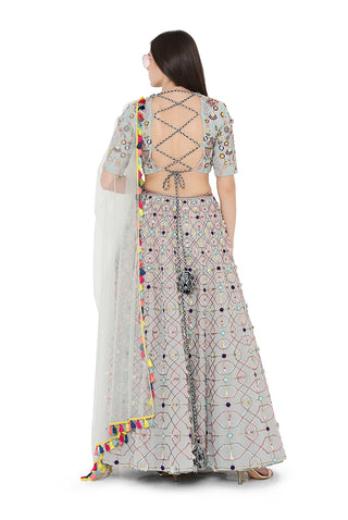 Seafoam embroidred one shoulder choli with embroidred belt lehenga with dupatta
