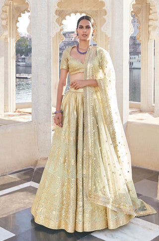 Sage green chrome applique georgette Lehenga with gold metal threads and yarns, teamed with a blouse with grid patterns and tassel details and a tulle dupatta with fringes.