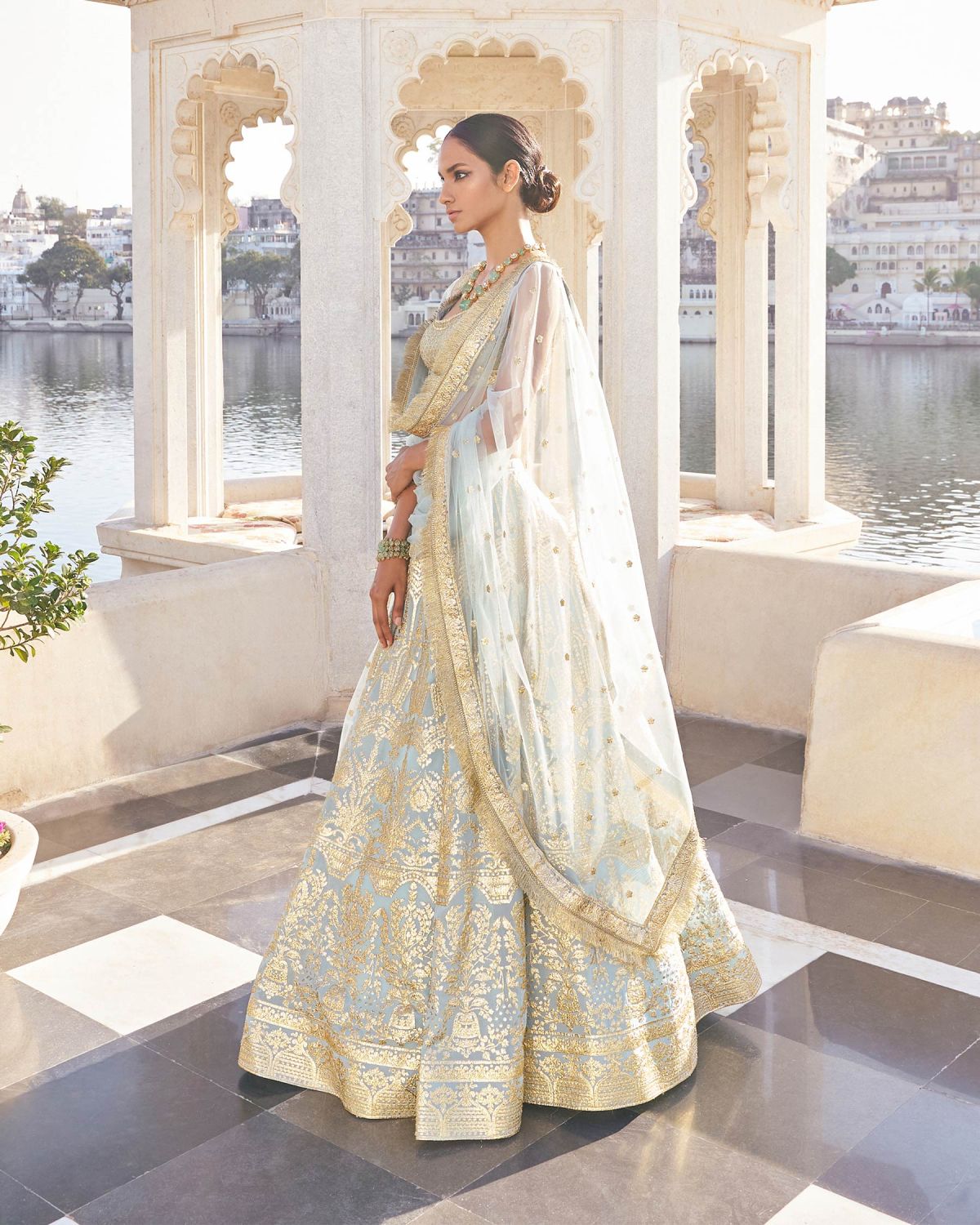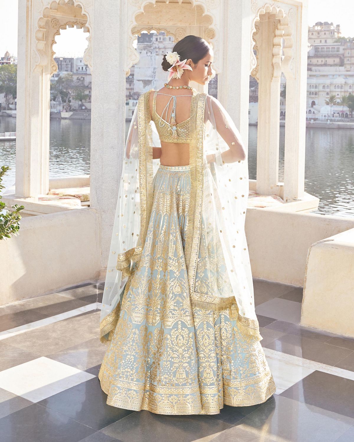 Chrome applique georgette Lehenga with gold metal threads and yarns, teamed with a blouse with grid patterns and a tulle dupatta with fringes.