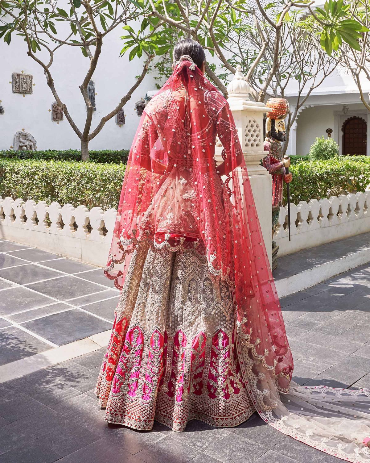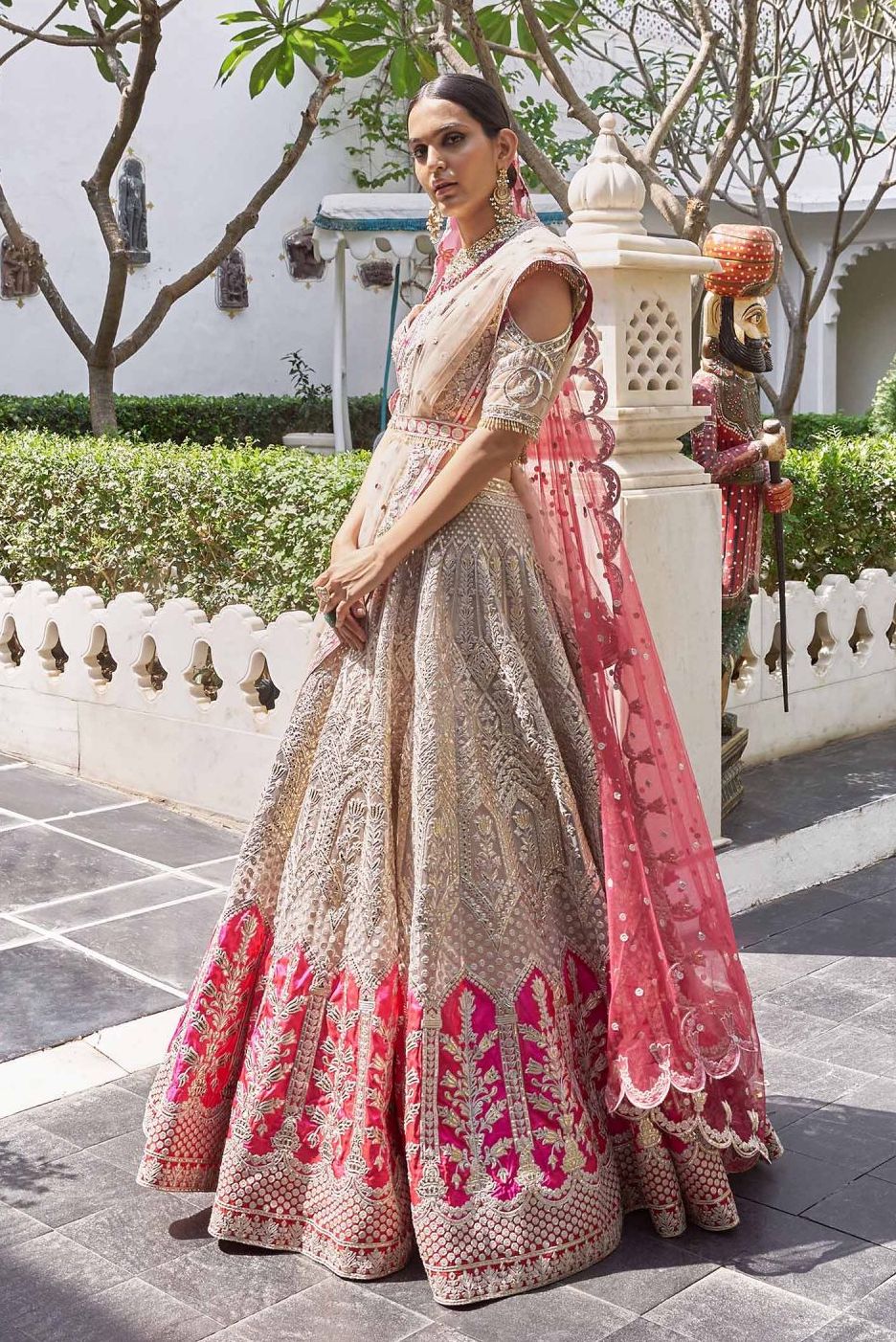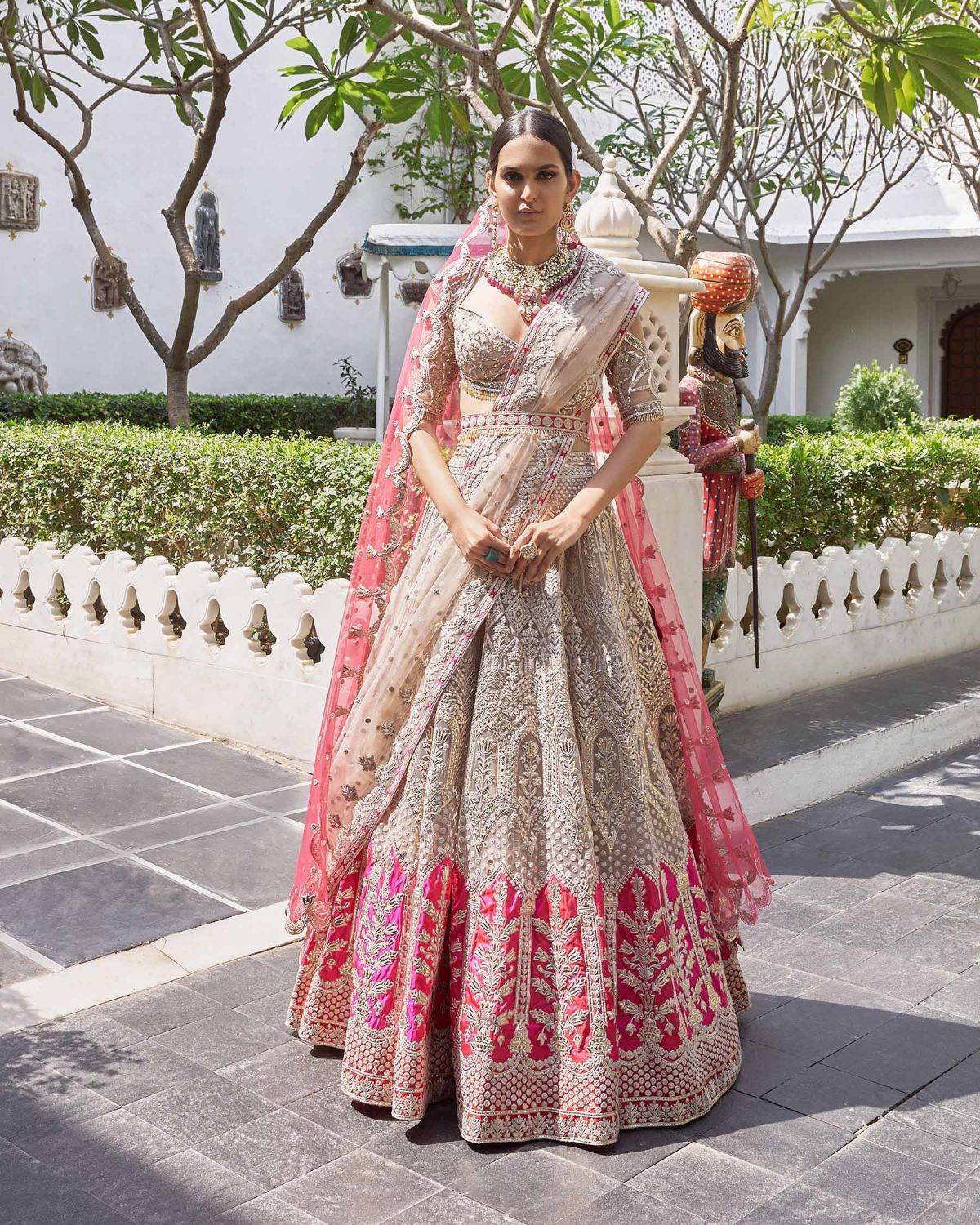 Beigeish grey tulle Lehenga with pure silk red and pink border embroidered over foliage and pillar motifs. Note style comes with 1 dupatta. An extra dupatta and belt, as pictured, is additional.
