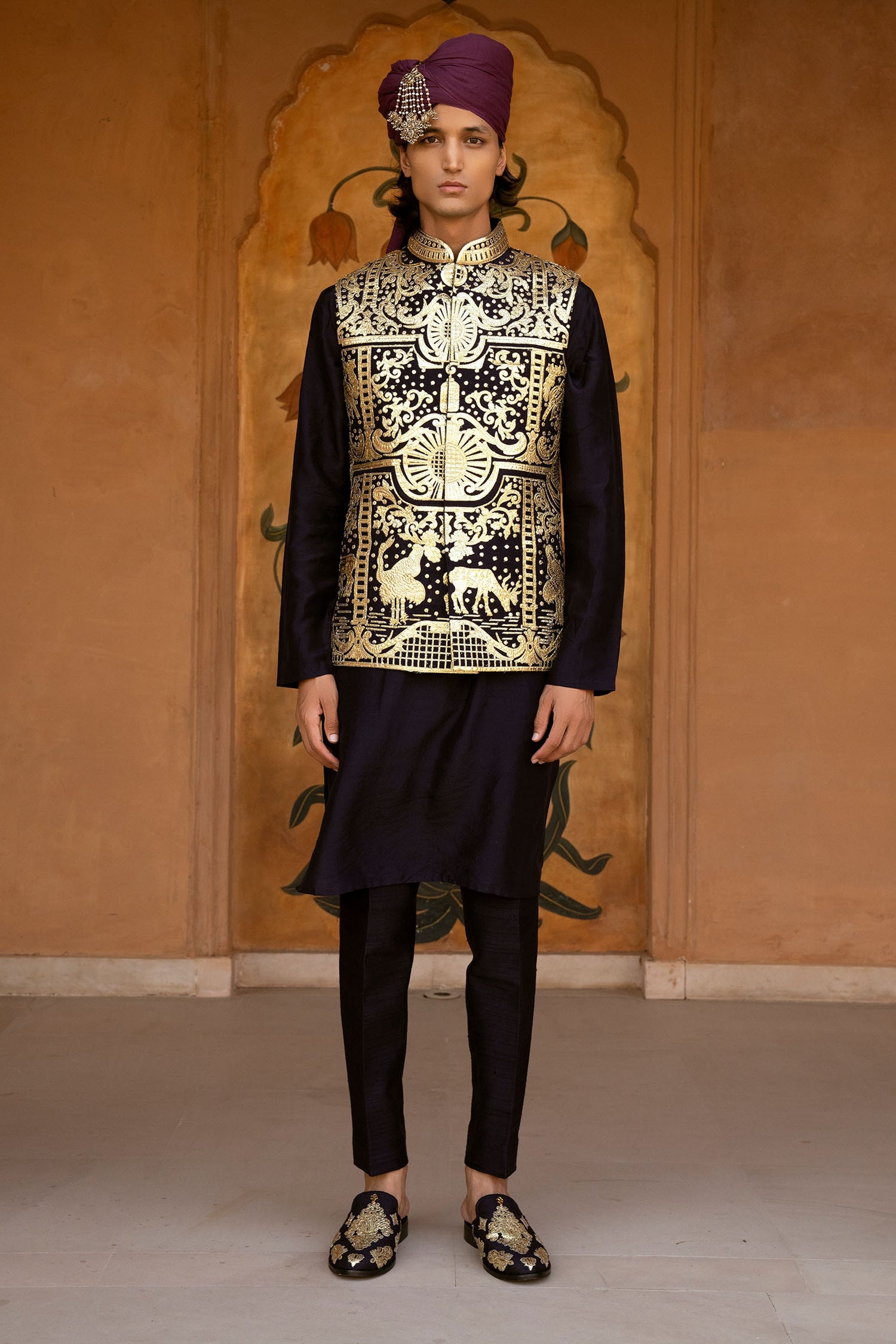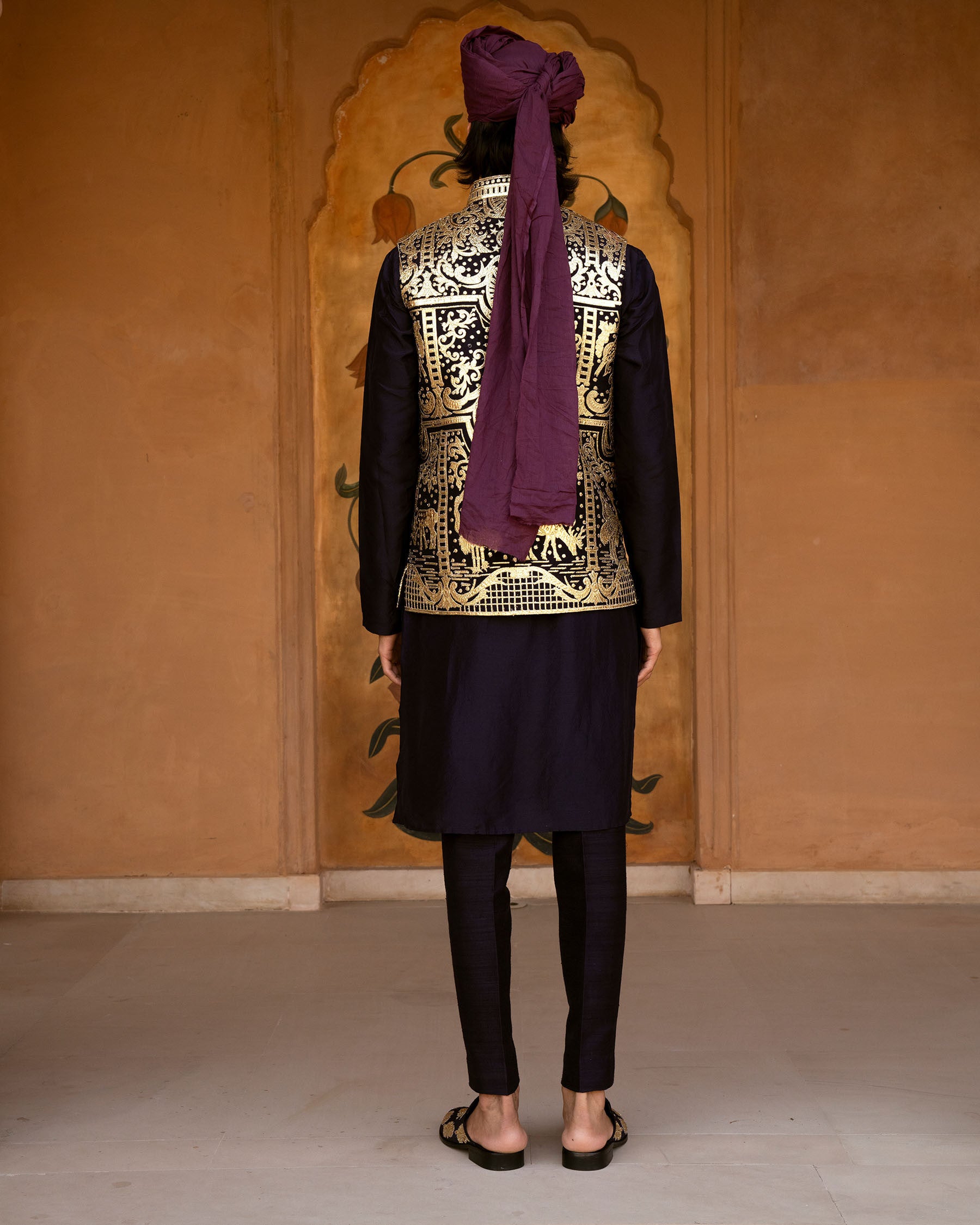 - DEEP PURPLE CHROME APPLIQUE BANDI ADORNED WITH ETHNIC MOTIFS AND TEAMED WITH A RAW SILK KURTA AND TROUSERS.