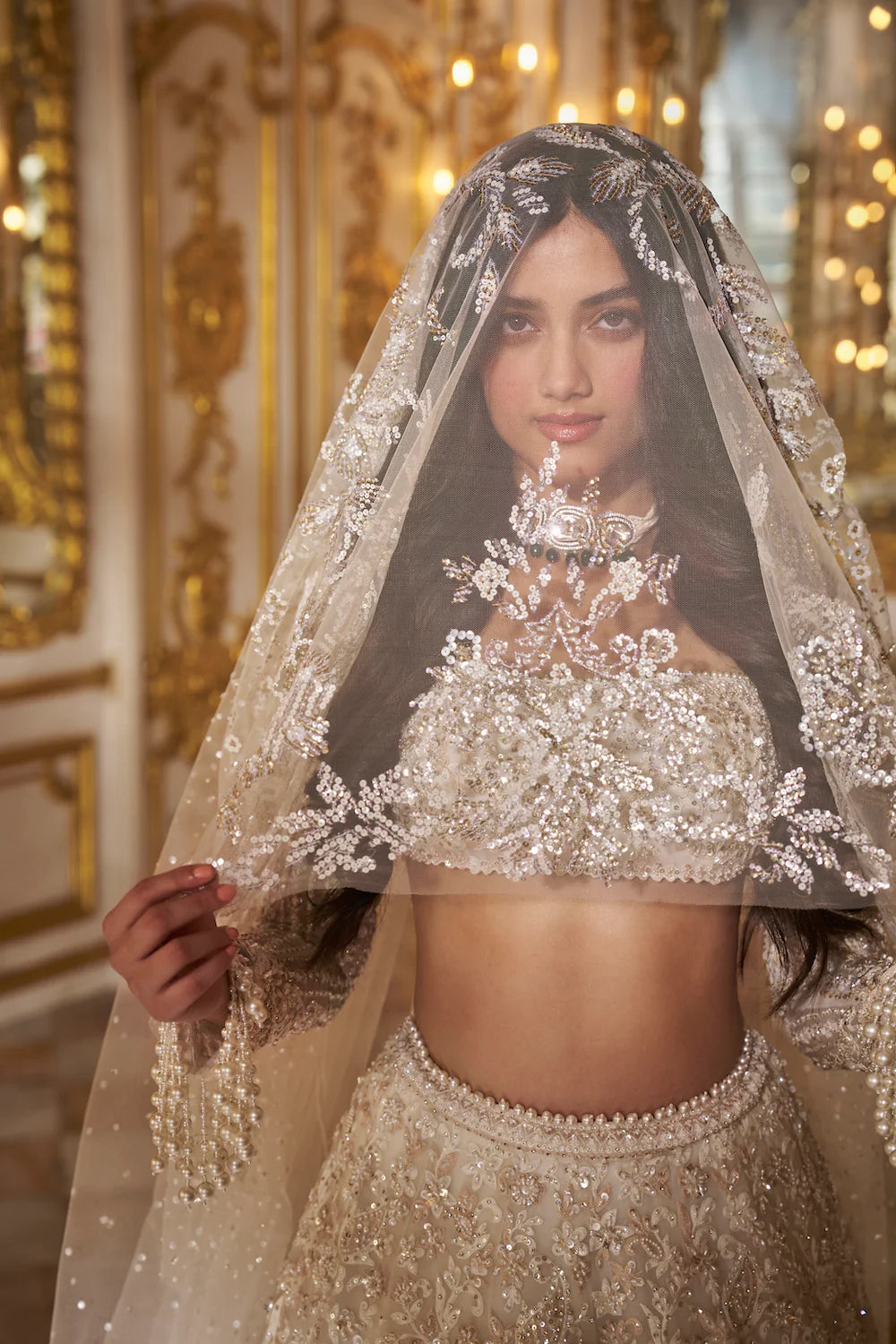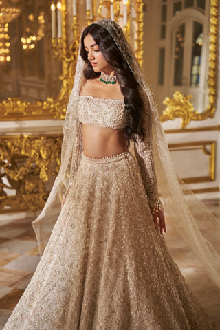 This lehenga set features all over thread embroidery in ivory and nude tones and highlighted with assorted pearls and crystals. It is paired with a full sleeves blouse. The sleeve hem shows exaggerated pearl tassels. The fully embroidered dupatta also shows pearl drops at all four sides.