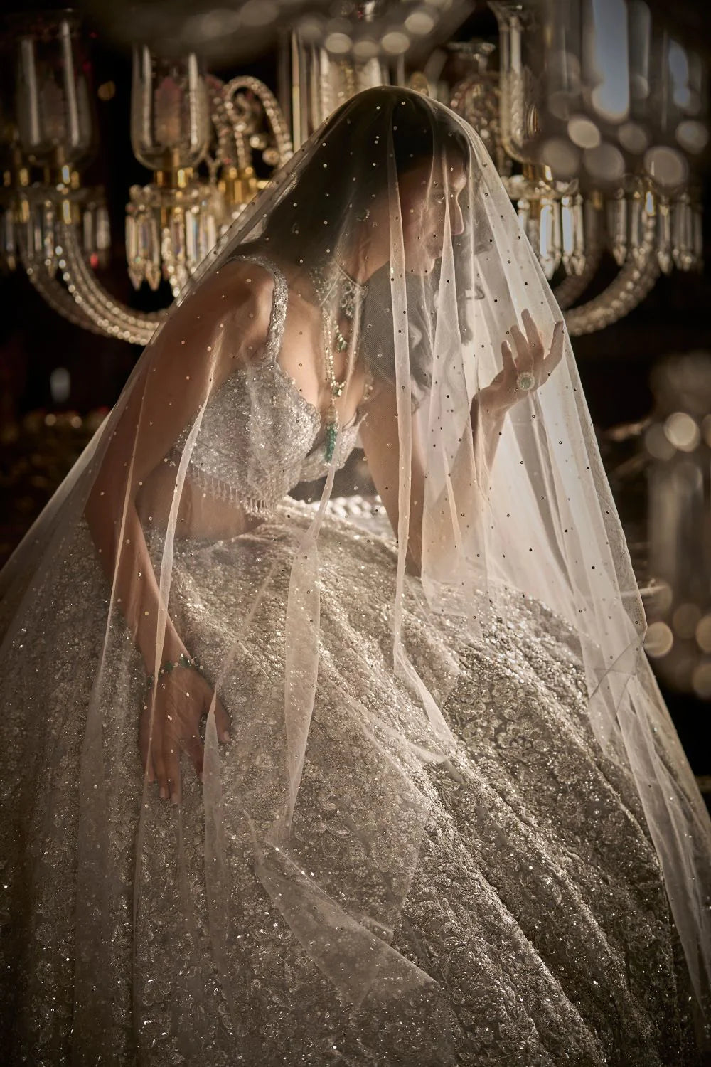 This lehenga set features very intricate embroidery in silver french notes, pearl and crystal. The lehenga ghera shows cut work. The bottom of the blouse too shows delicate crystal tassels. It is paired with scalloped dupatta with crystal tassels on all four sides.