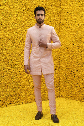 Old rose self embroidered sherwani with pants