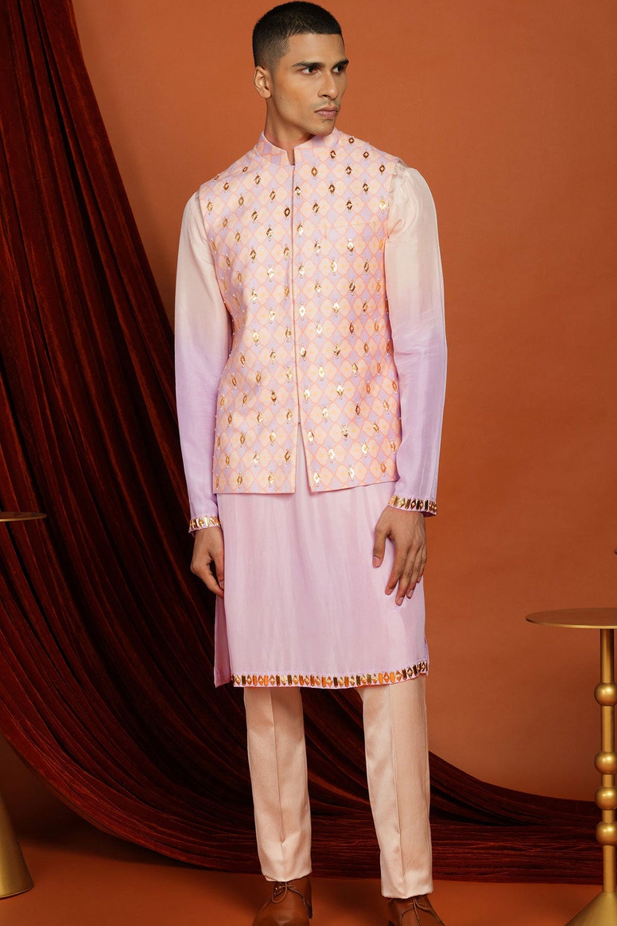 Mint printed dupion silk bandi with rose pink silk kurta and off white cotton silk churidar