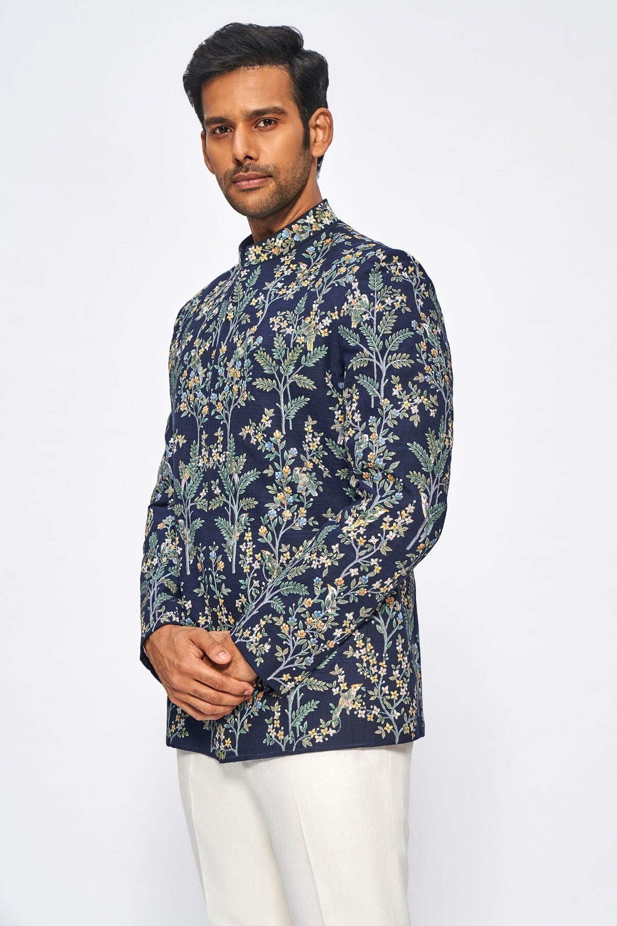 Invoking regal elegance, our Navy Bandhgala is hand-painted in Pichhwai artwork on the Matka silk fabric. With detailed hand embroidery on the collar, it comes with pockets to add depth and dimension overall.