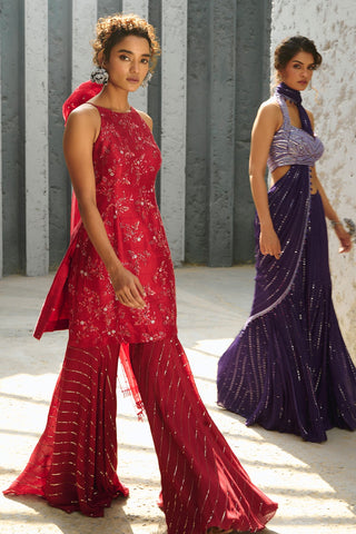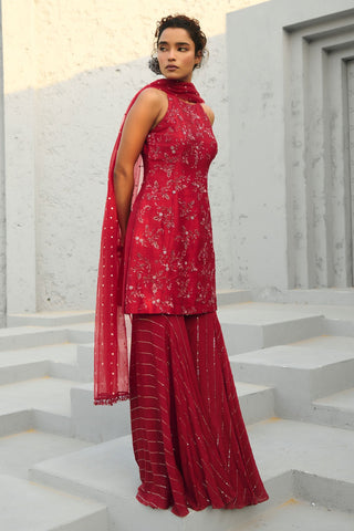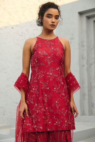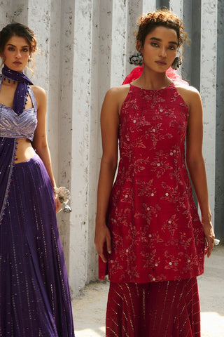 Deep red sequence and glass beads embellished halter neck kurta , paired with sequence embroidered sharara and tulle dupatta