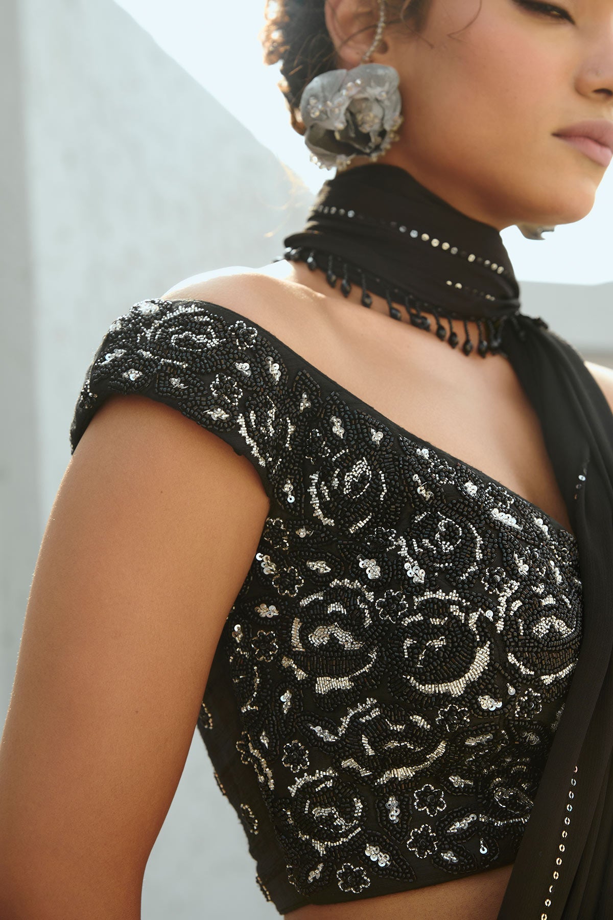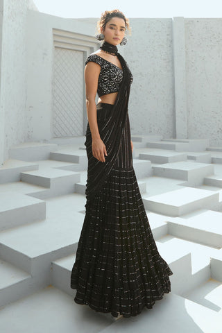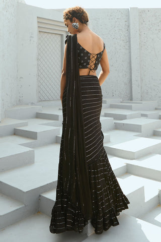 Black sequence embroidered pre-stitched frill saree paired with glassbeads encrusted offshoulder blouse