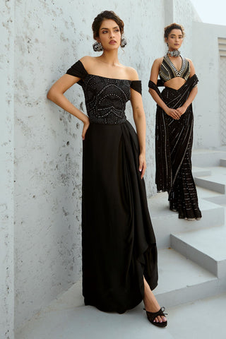 Black glassbeads and stone encrusted offshoulder corset paired with satin drape skirt