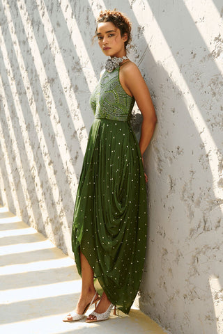 Basil green glassbeads and stone embellished halter neck cowl dress