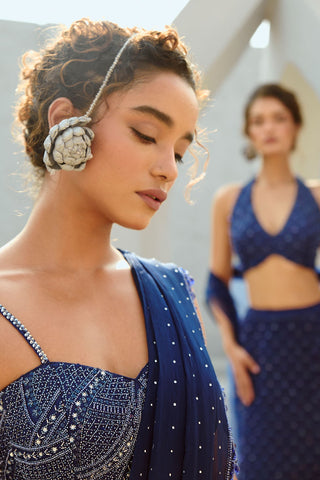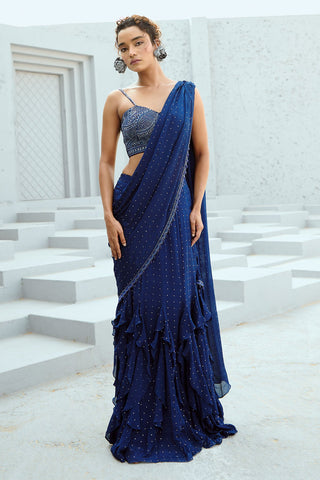 Deep blue pre-stitched cascade saree with glassbeads embellished pallu paired with intricate glassbeads and stone embroidered spaghetti blouse