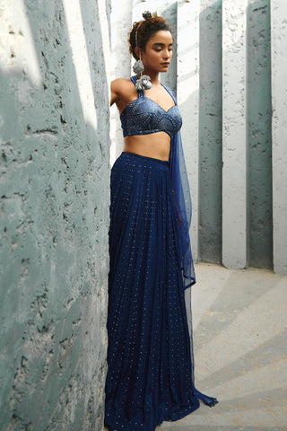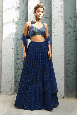 Deep blue rushing lehenga paired with glassbeads and sequence embellished halter neck blouse and soft tulle dupatta