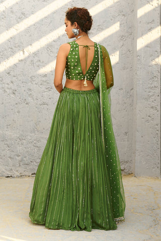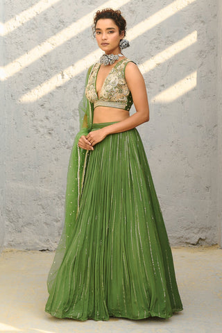 Basil green sequence embroidered rushing skirt paired with glassbeads and sequence embellished deep v-neck blouse and soft tulle dupatta