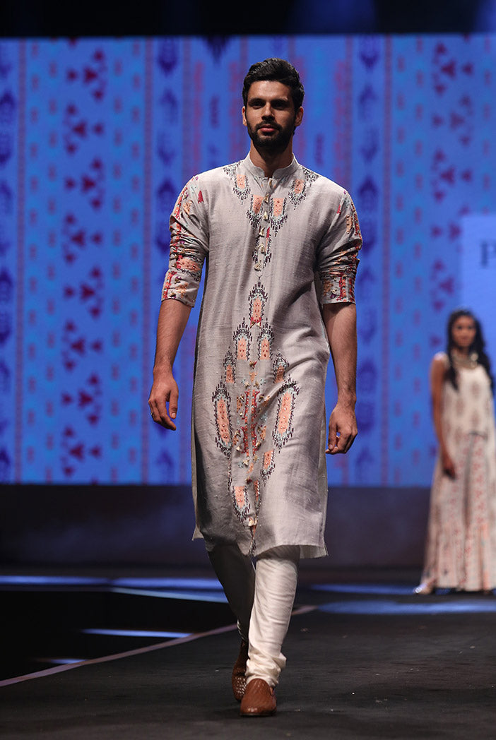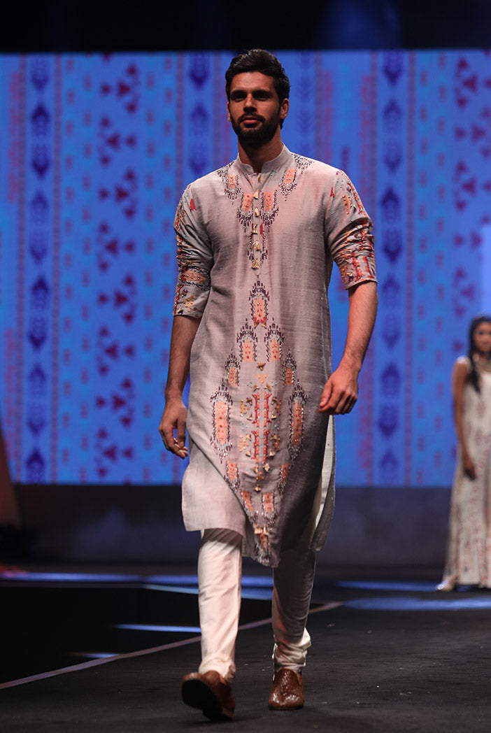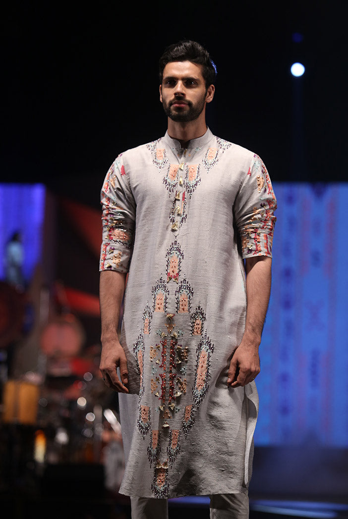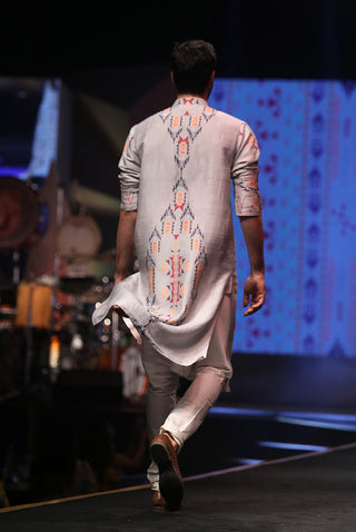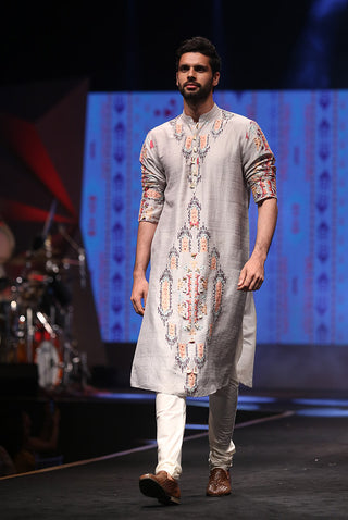 Grey Ikat Carpet Print Embroidered Dupion Silk Kurta with Off-white Cottonsilk churidar.