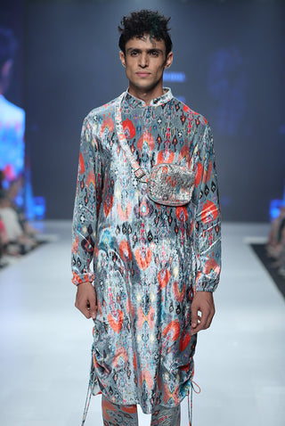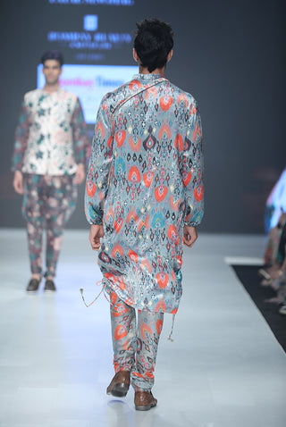 AZIZ BLUE PRINTED VELVET KURTA AND SILKMUL CHURIDAR