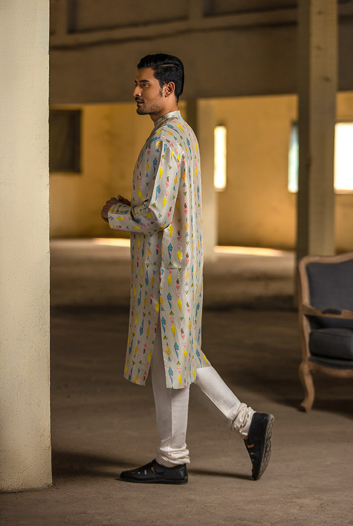 Multicolour fish print silk kurta with off white cottonsilk churidar.