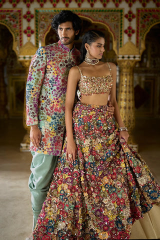 Multi-coloured three-dimensional floral lehenga set