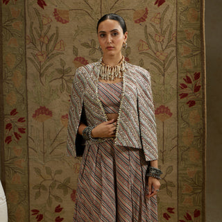 Featuring a biege boho stripe print cape jacket set paired with flared pleated pants and bustier.