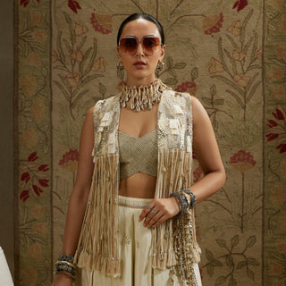 Featuring a magnolia cream threadwork fringe jacket with metallic bustier and flared pants.
