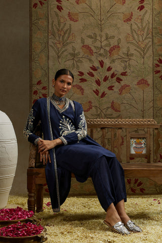 Deep blue drape skirt with fully embroidered bustier and caper with appliqué flowers