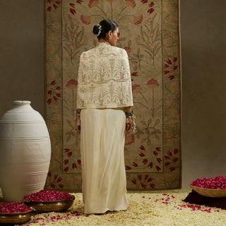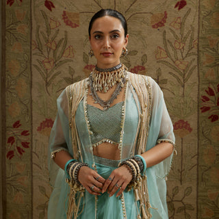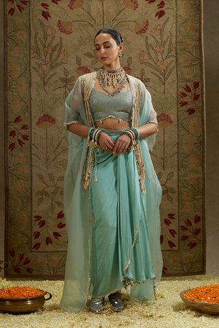 Ombre cape with silver embroidered bustier and nusrat drape skirt