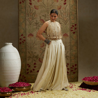 Textured crop top teamed with embellished pink butti print box pleat pants