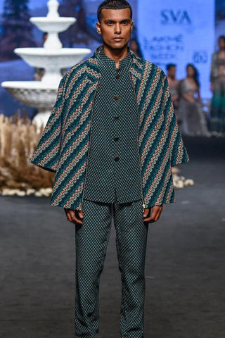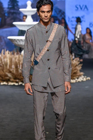 Black geometric print crepe blazer jacket teamed with linen bustier and pants