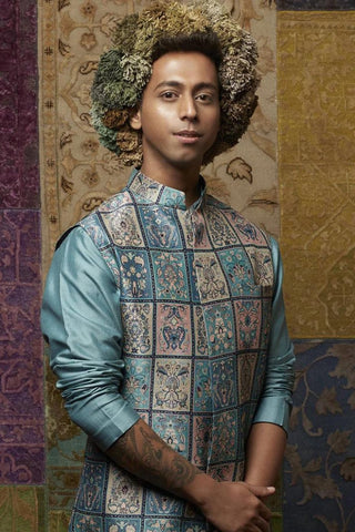 Blue rasa jaal print lehenga with dolman sleeves crop top