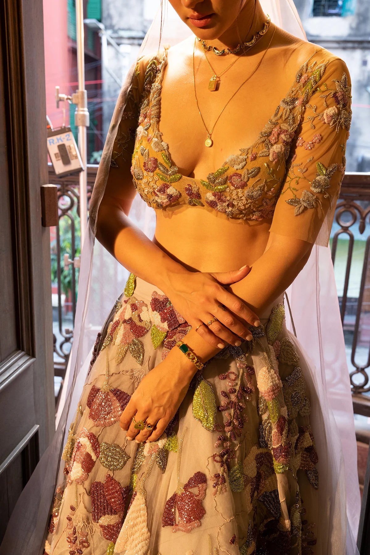 Skirt - A field of poppies, appliquéd with water-coloured silk, hand dyed kosa, one million stitches, violet stained glass beads. Delicate flowers of kora and zari. Leaves of chartreuse and olive leaves in zardosi. Lots of under layers of silk and tulle and cancan.