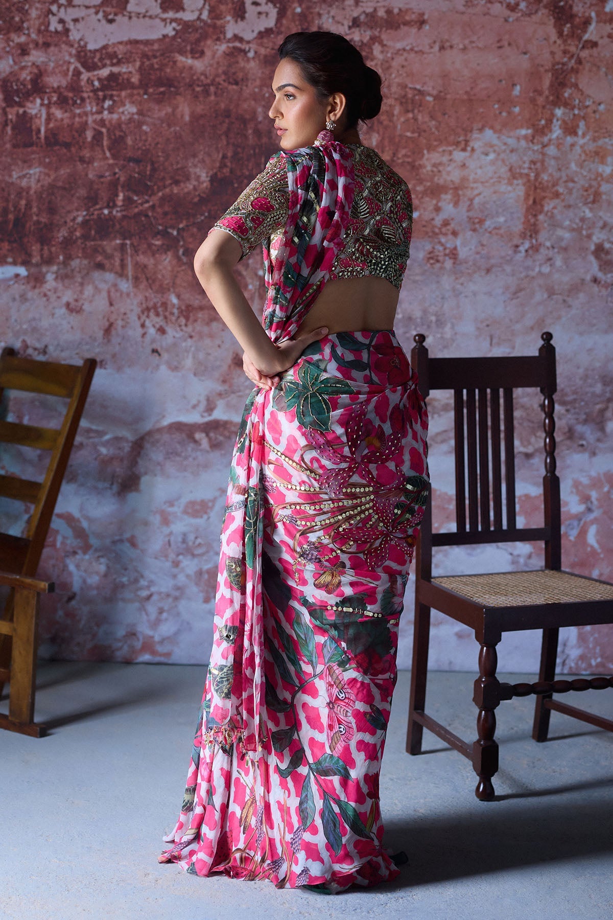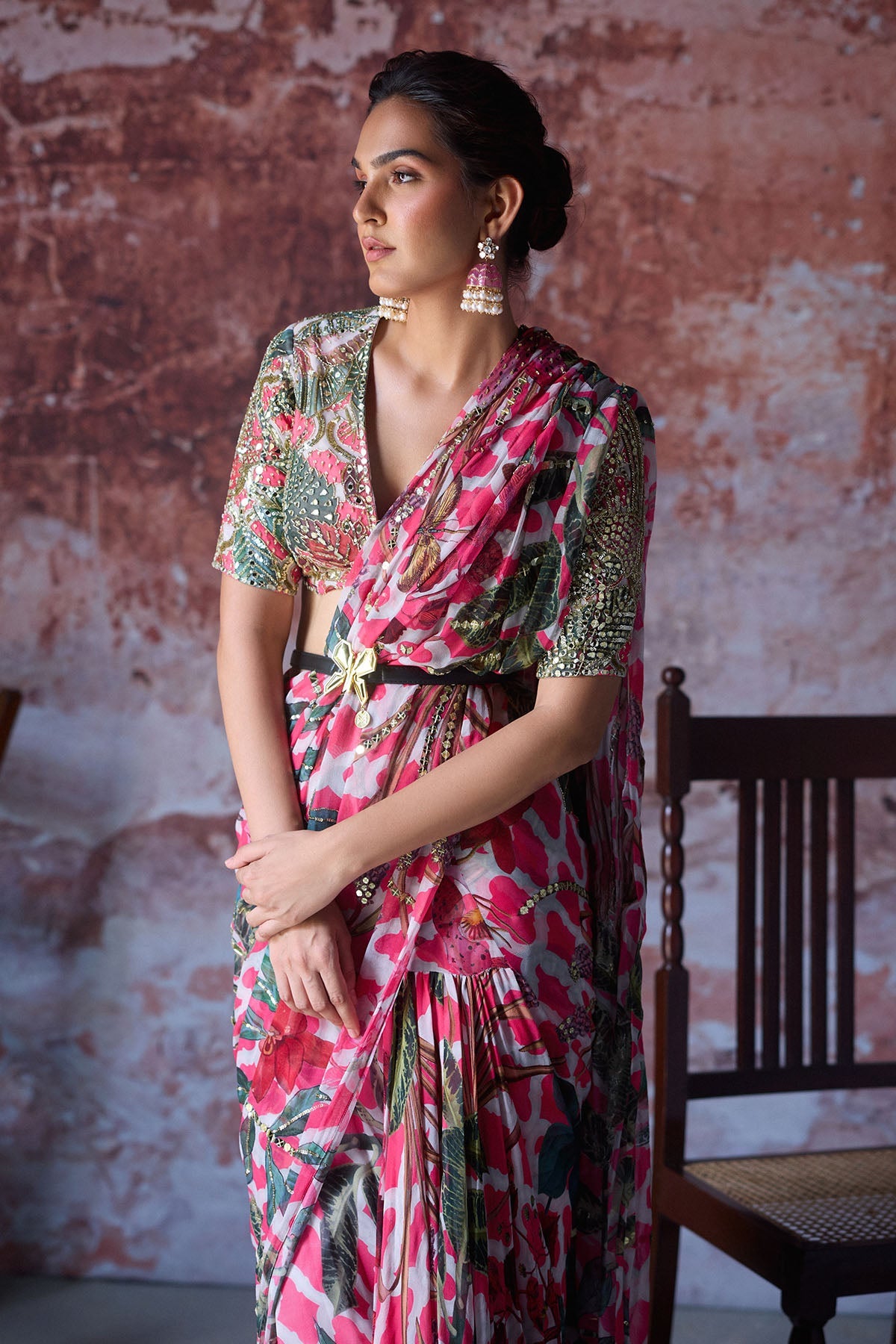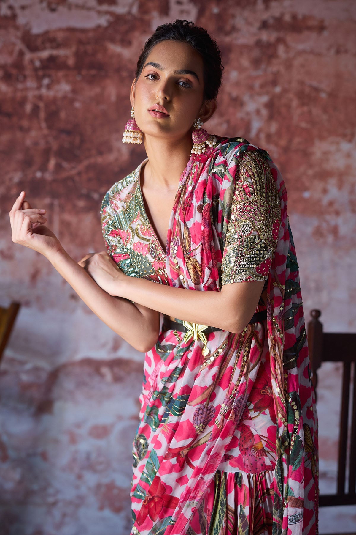 EMBROIDERED RUFFLED SAREE WITH EMBROIDERED BLOUSE AND OUR SIGNATURE LEATHER BELT WITH MM LOGO BUCKLE .