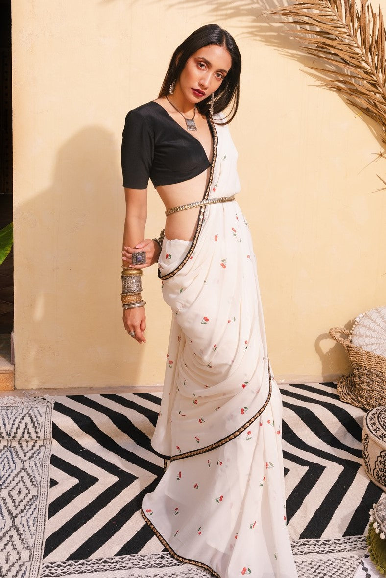 A silk georgette cherry printed sari with a black embroidered border and a vintage style silk crop blouse and a silver metal waist belt.