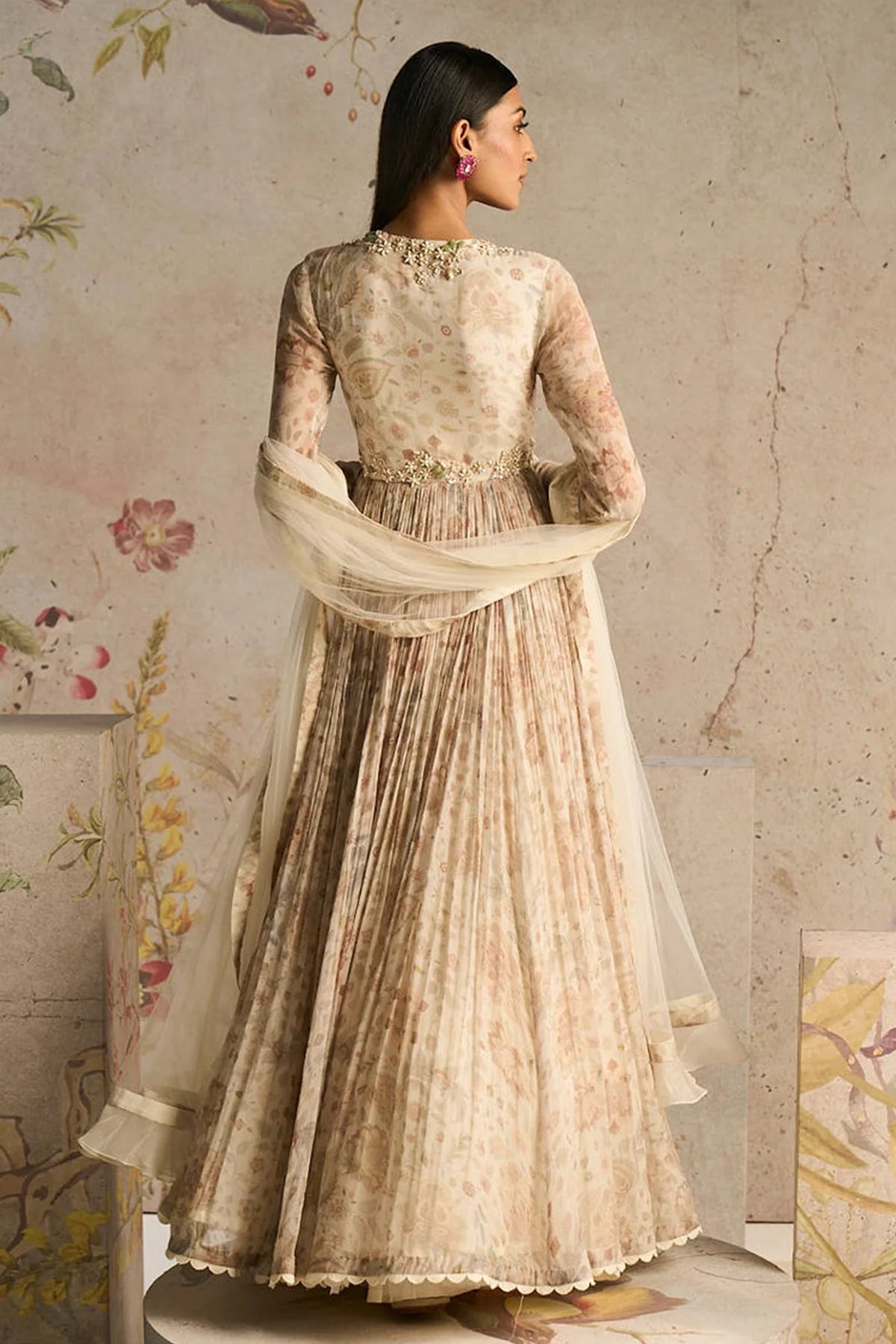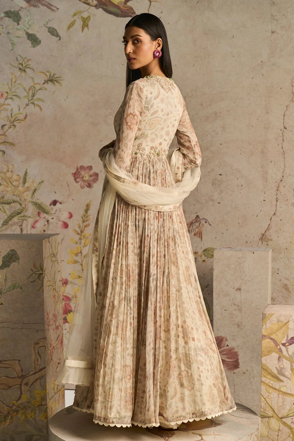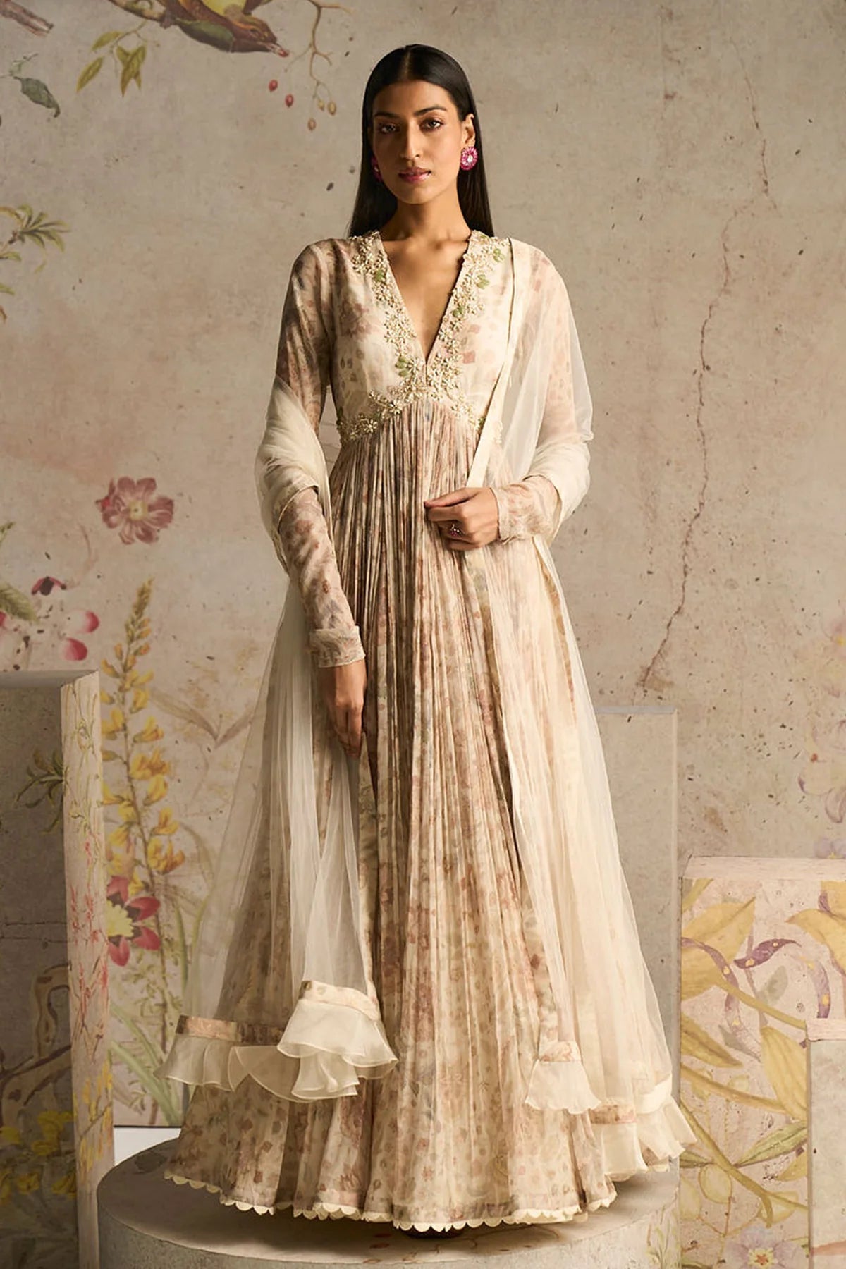 Ivory Printed Chiffon Long Anarkali Paired With Net Embroidered Dupatta
