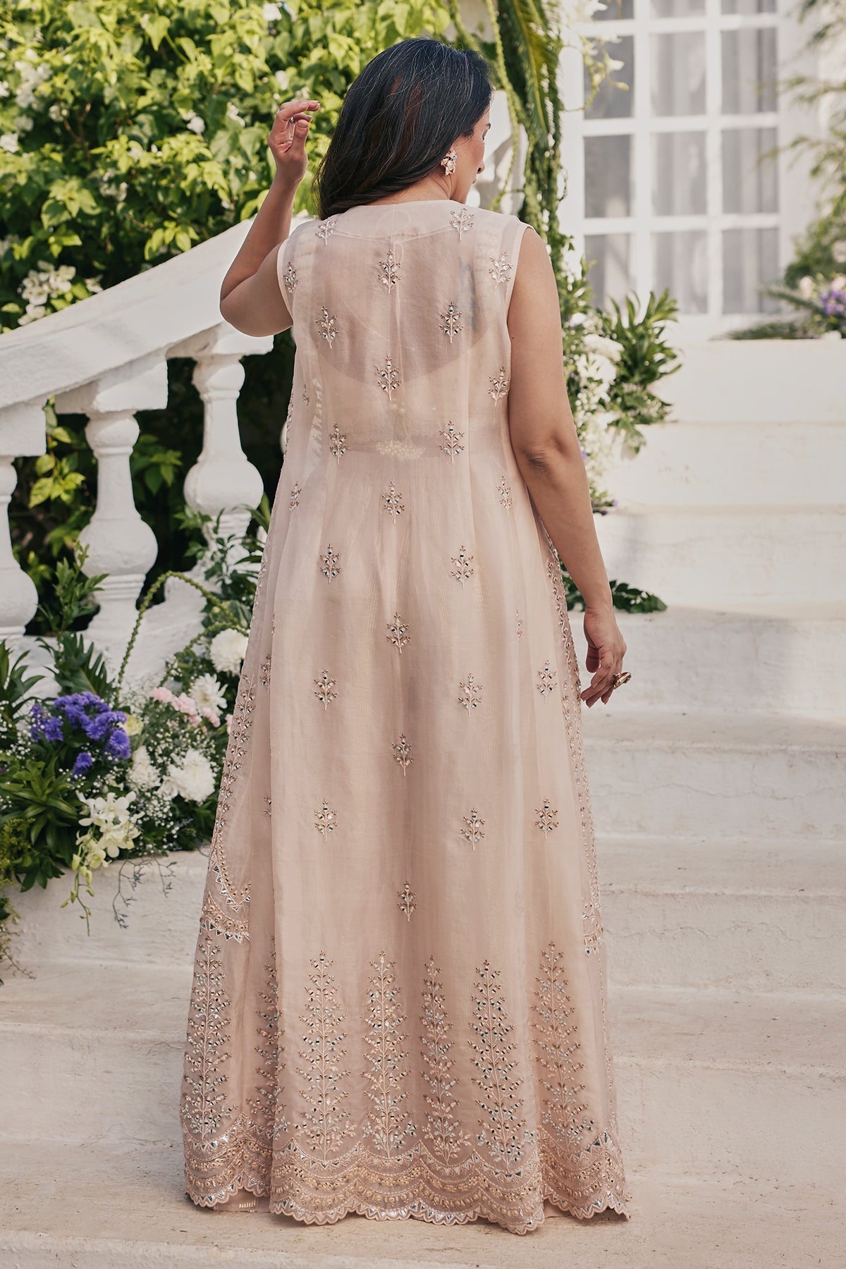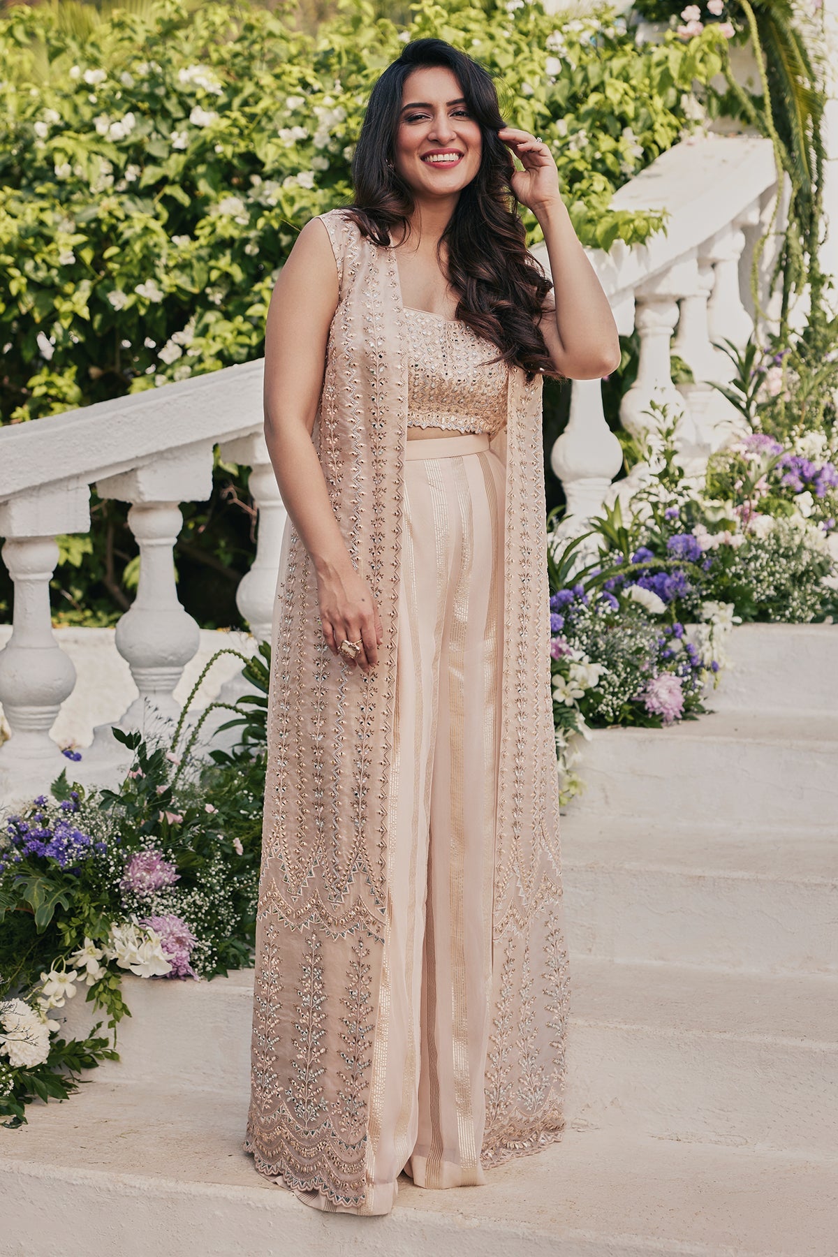 Peach raw silk embroidered blouse with mirror and gota work detailing paired with georgette pants and organza embroidered jacket.