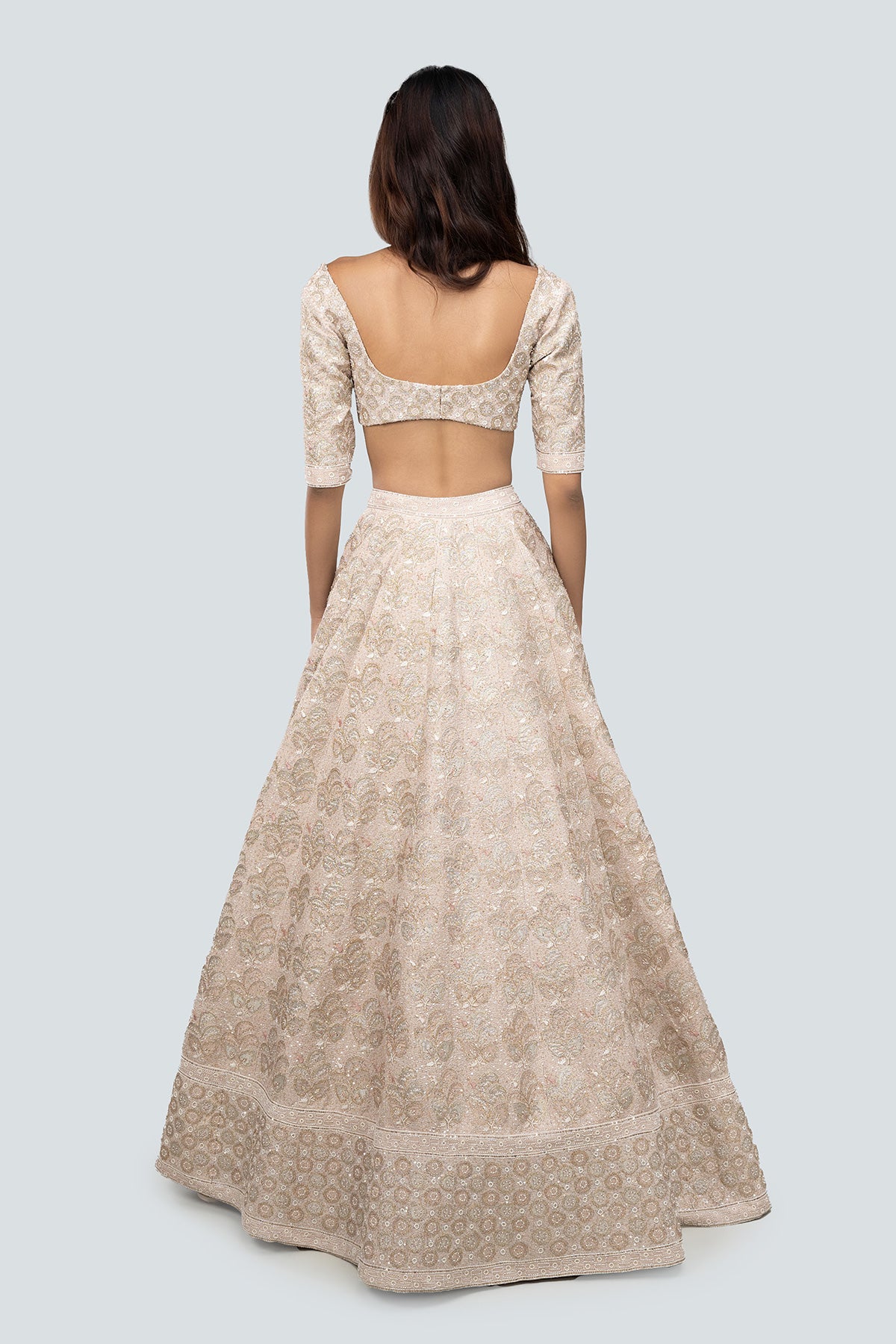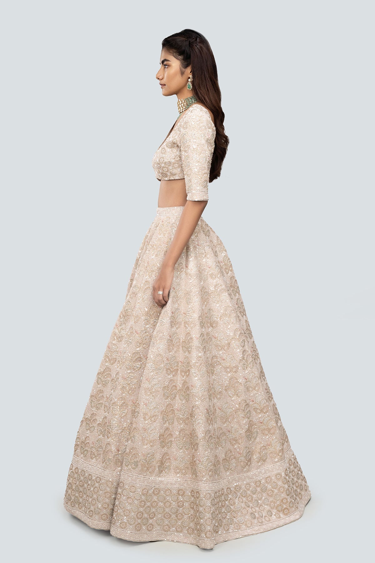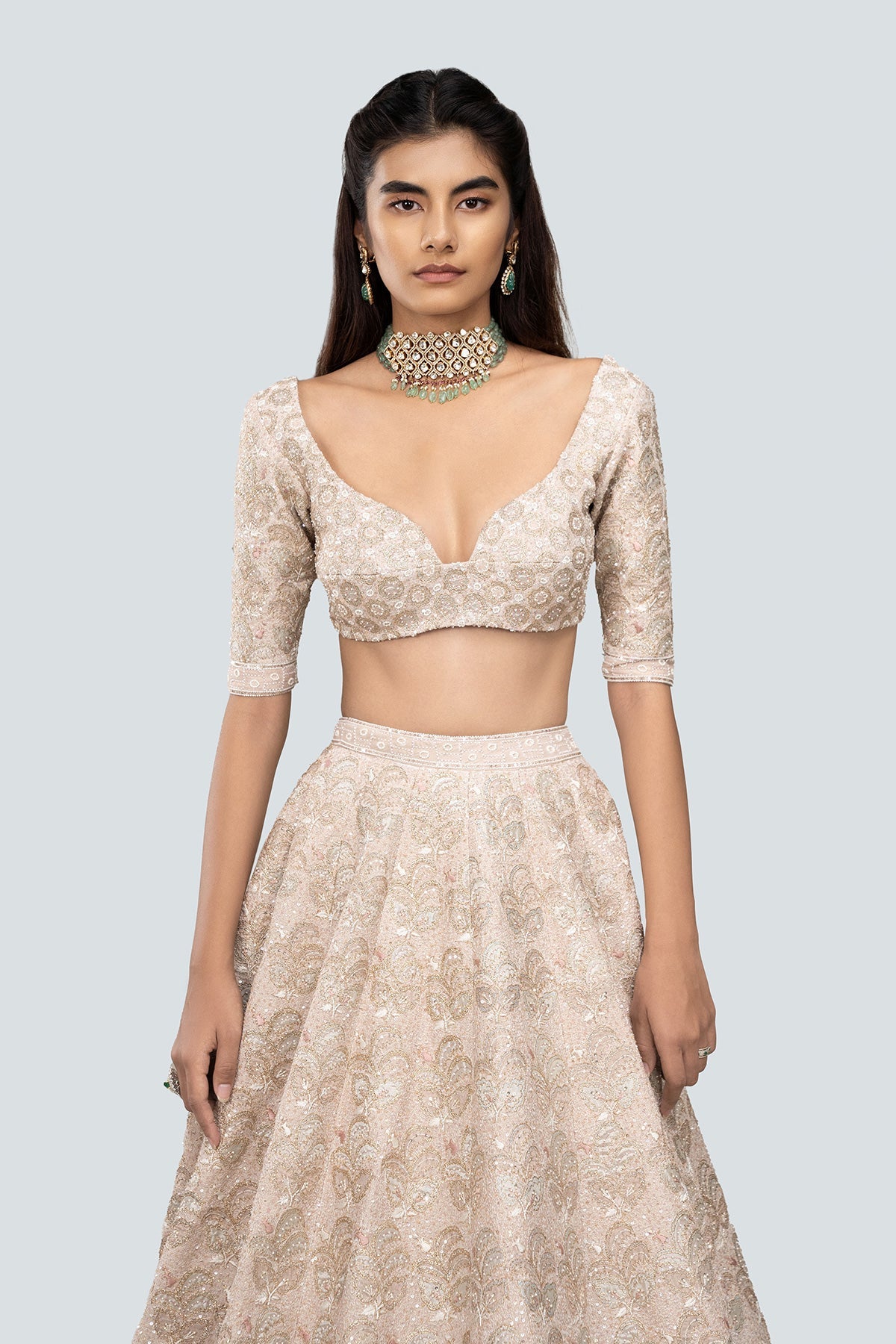 Pastel tissue applique and heavy embellished raw silk kali lehenga with blouse and cutwork border net dupatta.