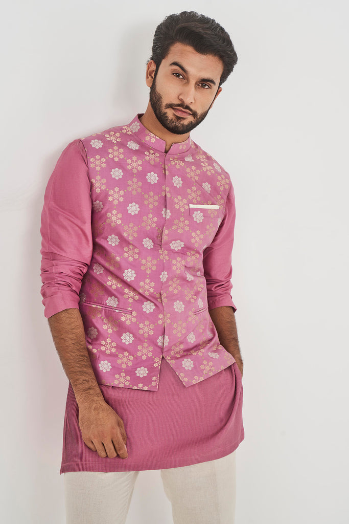 A classic Benarasi Nehru jacket is the perfect wardrobe staple. The Aayansh Nehru Jacket in lilac can be worn to a brunch or dressed up for a formal evening, no matter what season..