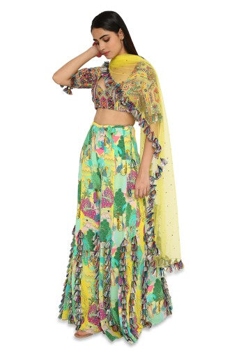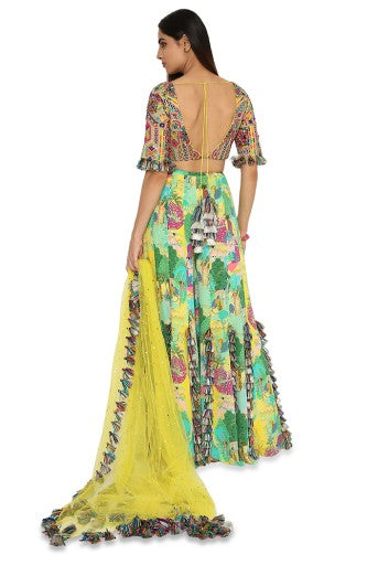 Adana yellow colour georgette embroidered choli with yellow colour sharara and yellow mukaish organza dupatta