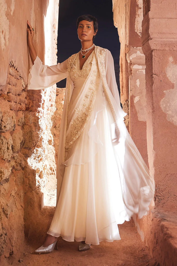 Ivory Embroidered Chiffon Jacket And Jumpsuit Paired With Embroidered Chiffon Drape