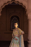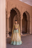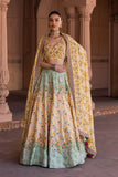 Mint & Yellow applique lehenga with detailed hand embroidery with fresh colours teamed with a beadwork croptop & a floral duppata with thread and marodi work