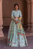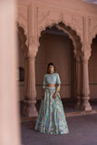 Light green lehenga with detailed floral print teamed with a hand beaded & threadwork crop top & printed dupatta